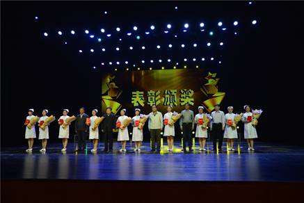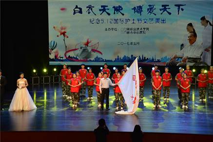 演出中,校领导马旭东为yl23411永利(集团)有限公司官网新成立的“天使之翼红十字志愿服务队”授旗,三门峡职业技术学院和市中心医院的领导还为获得护理技能竞赛优秀辅导老师代表、优秀护士长、优秀男护、优秀护士、培训教师进行了表彰颁奖。