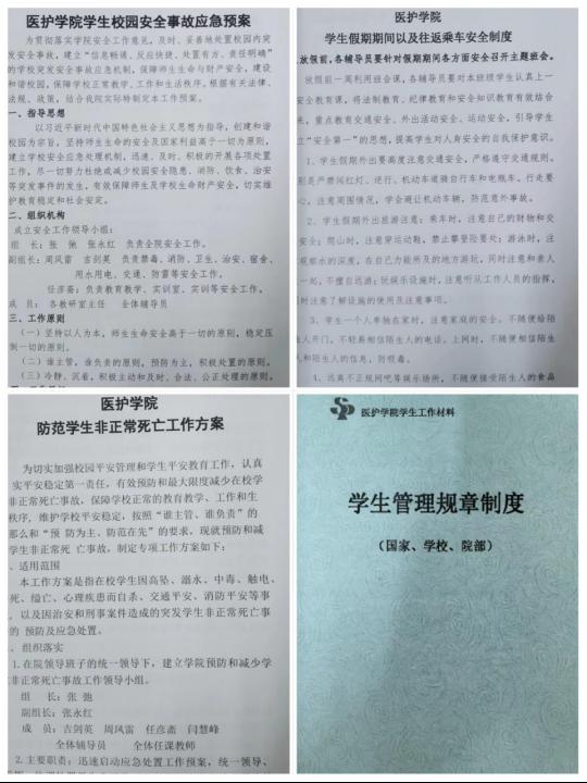 在学生日常管理,以学生安全工作为“锚点”,完善保障机制:一是优化领导管理队伍,形成“院领导--辅导员--学生干部”三级网格化安全管理体系,明确责任分工,畅通沟通渠道,扎实做好各项安全工作;二是严格落实学生请销假制度,完善台账管理,制定突发事件应急处理预案,确保各项制度落到实处;三是强化安全责任意识,做好重要时间节点安保工作。