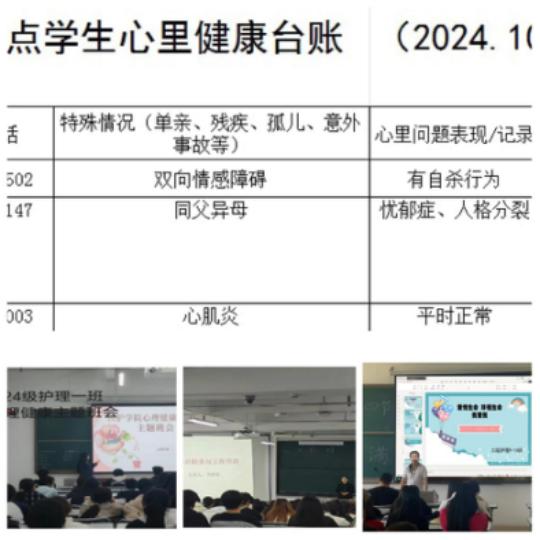 建立心理关注联动机制,成立以院部书记为组长,学生管理副院长、学生科长为副组长,各班辅导员为成员的心理健康教育指导组。各班心理委员作为各班心理信息第一报告人,及时上报心理疾患学生情况,辅导员密切与心理健康中心老师保持联系,针对心理疾患生、违纪生、特困生等及时地开展耐心细致的思想教育工作,同时与学生家长密切联系,共同关注,建立完善的心理健康档案,对学生的心理状态进行持续性的跟踪监测与科学评估,有效干预潜在的心理问题,为学生的全面发展与健康成长提供坚实有力的支撑。