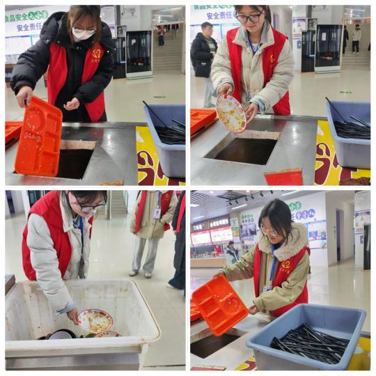 在餐盘回收区,另一组志愿者们正忙碌而有序地引导食客文明用餐。他们面带微笑,轻声提醒食客们按需取餐,践行“光盘行动”,减少食物浪费。待食客用餐完毕,志愿者们主动上前帮忙收拾餐盘,将其分类放置在指定区域,方便后续清洗。