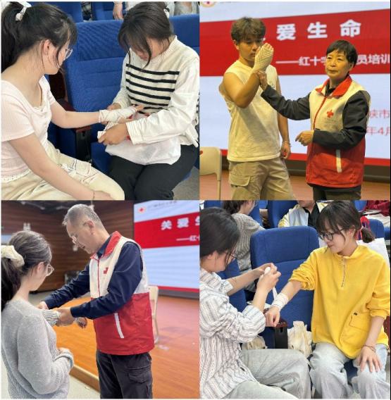 贺俊匣老师的创伤救护课程同样精彩纷呈。通过现场演示,贺老师系统讲解了绷带环形包扎法、螺旋包扎法、螺旋反折包扎法,以及三角巾头部包扎、胸部包扎等多种实用技术。“包扎不仅是技术,更是艺术”贺老师强调,“要做到‘三查三注意’:查伤口、查出血、查骨折;注意松紧适度、注意功能位保持、注意伤者感受。”学员们通过互相练习,掌握了不同伤情的包扎要领。
