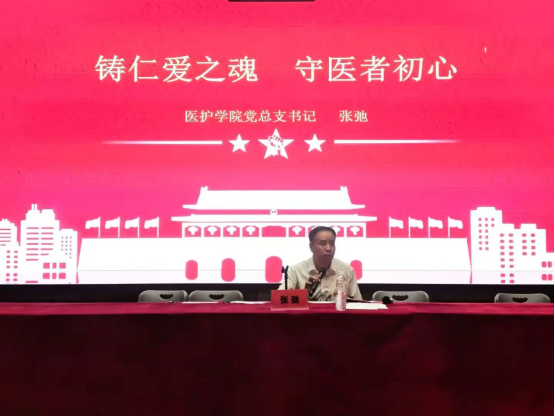 典礼结束,学院领导为新生讲授“开学第一课”。党总支书记张弛以《铸仁爱之魂,守医者初心》为题,从阅兵盛事切入,为同学们阐释了“仁心”和“初心”的深刻内涵以及如何“守初心,铸仁魂”,希望同学们将观看阅兵时的那份热血沸腾和家国豪情,转化为日后在图书馆里的静心苦读、在实验室里的严谨求索、在解剖台上的敬畏尊重、在临床实践中的精益求精。张书记从理想信念和医德医风层面进行了深刻阐述,为新生们的成长成才奠定了坚实的思想基础。