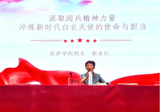 院长张永红以《汲取阅兵精神力量,淬炼新时代白衣天使的使命与担当》为题,与同学们共同探讨了阅兵精神给我们未来的学习和职业道路带来的启示,引导同学们从“整齐划一”中领悟职业规范的深刻内涵;从“大国重器”感悟技能报国的时代使命;从“使命担当”中读懂医者仁心的职业真谛看职业信仰与人文情怀;从“体系作战中”认识团队协作与沟通能力的重要价值;希望同学们在新的人生“阅兵场”上,立规矩、学本领、修仁心、强体魄,接受祖国和人民的检阅。