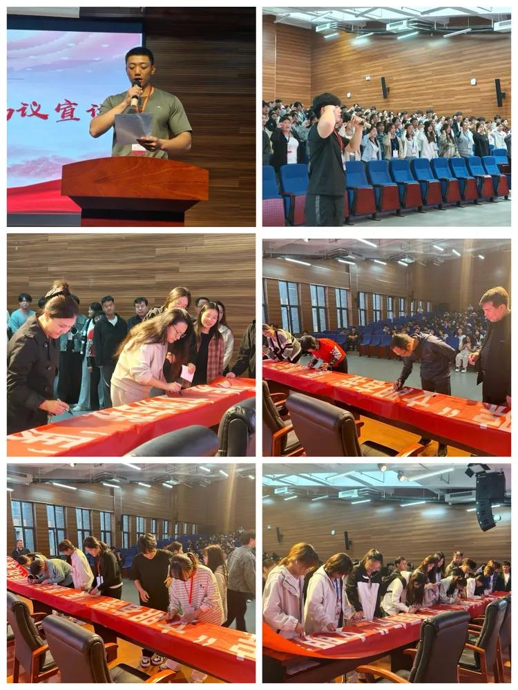 激动人心的文明养成教育活动启动仪式将大会推向高潮。自管会主席汪坷均同学代表全体学生干部宣读《“文明素养•医路同行”倡议书》,号召大家从自身做起,践行文明行为。团总支副书记张睿豪同学带领全体学生干部齐声宣读《yl23411永利(集团)有限公司官网学生干部文明公约》,声音铿锵有力,彰显了他们践行文明公约的坚定决心。宣读完毕后,全体师生有序前往签名横幅处郑重签名承诺,用实际行动表明引领文明新风的信念。