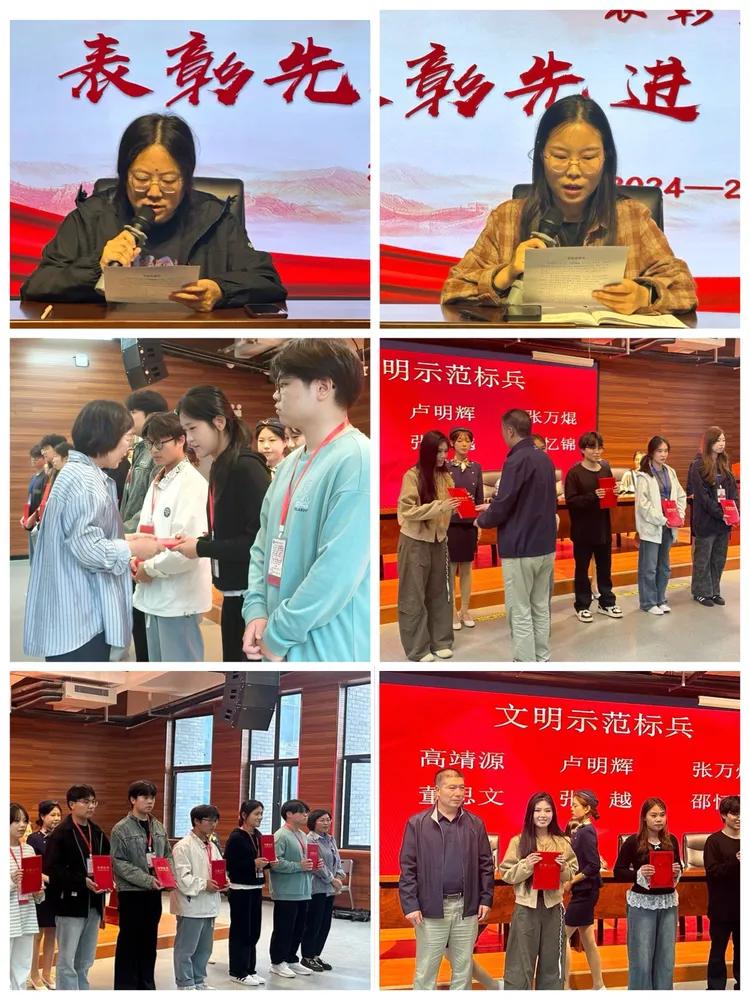 随后进入表彰环节,创新创业协会负责人宁倩老师和团总支书记郭亚楠老师分别宣读2024- 2025学年第二学期“优秀学生干部”及“文明示范标兵”名单,党总支副书记周凤雷和学生科科长闫慧峰老师分别为2024 - 2025学年第二学期“优秀学生干部”及“文明示范标兵”进行表彰,在热烈的颁奖音乐声中,获奖同学依次上台领奖,现场掌声雷动,这不仅是对优秀学子的肯定,更激励着全体学生干部积极进取。