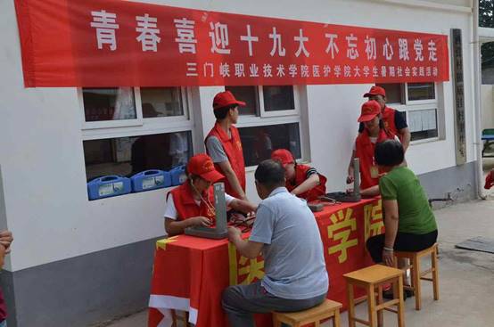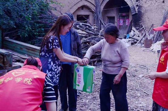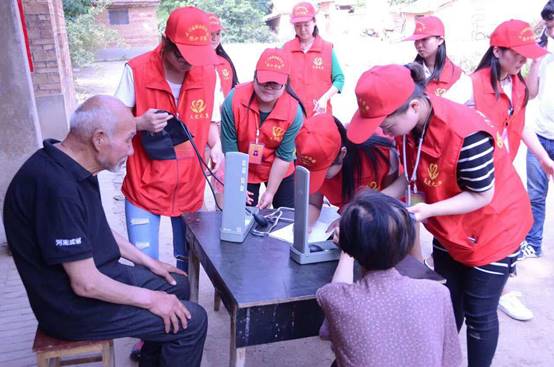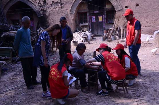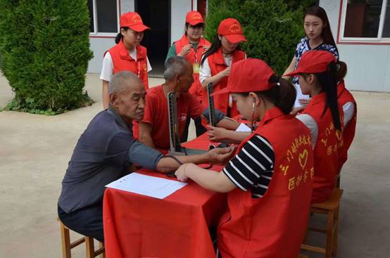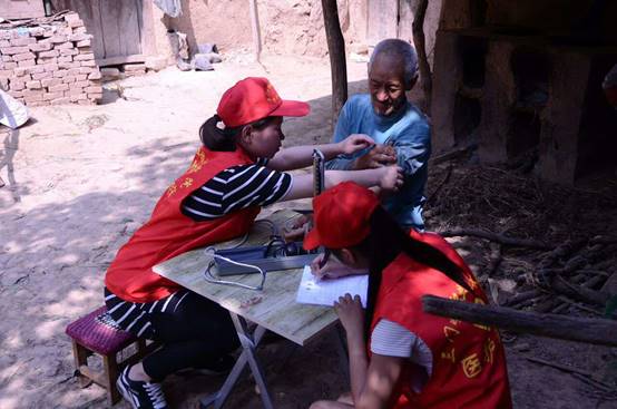 上午8点,志愿者们来到庙洼村,为使老人和孩子们感受到更多的爱与温暖,他们特意准备了牛奶,粘土,笔记本,画笔等。志愿者们分成两组,一组人员运用所学的专业知识为老人们进行健康义诊,并为他们建立健康卡,走街串巷向村民们发放保健知识宣传单,讲解当季流行病和慢性病的预防知识等;另一组走访贫困户慰问独居老人,为他们送去慰问品,陪他们聊天,做一些力所能及的事,让老人们感受到来自天使的温暖。