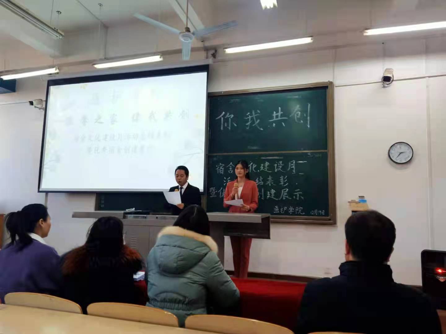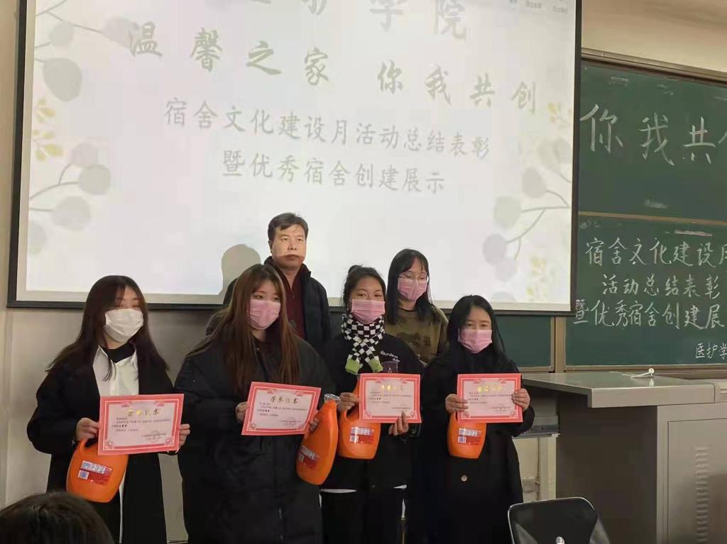 负责宿舍管理的李少康老师对本次活动做点评,肯定了同学们的成绩,希望大家再接再厉,再创佳绩。闫慧峰科长宣读了优秀宿舍名单。在本次宿舍文化创建活动中,共有55个宿舍被评为院部优秀宿舍,25个宿舍晋级校级优秀宿舍。他说希望通过本次创建活动,让文明之花绽放在医护的每一个宿舍中。宣读完毕,与会领导为获奖宿舍颁发荣誉证书和奖品并合影留念。