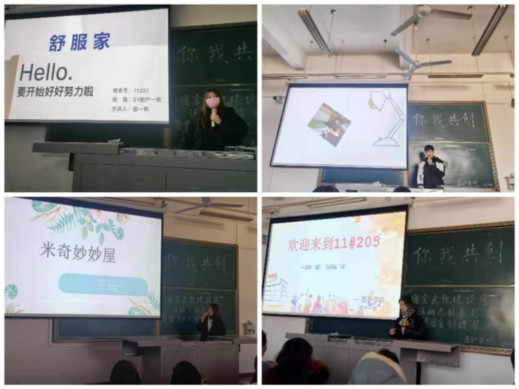 活动伊始,由9名宿舍长作为优秀宿舍代表进行创建展示。主持人介绍规则之后,各宿舍长一一上台展示。他们通过PPT介绍了宿舍成员、宿舍文化、宿舍公约等,诙谐幽默的方式,独具特色的介绍,令人眼前一亮。展示结束,在场人员一起观看了优秀宿舍视频合集,了解优秀宿舍的创建过程。