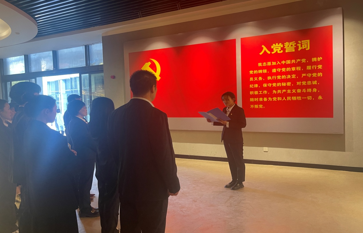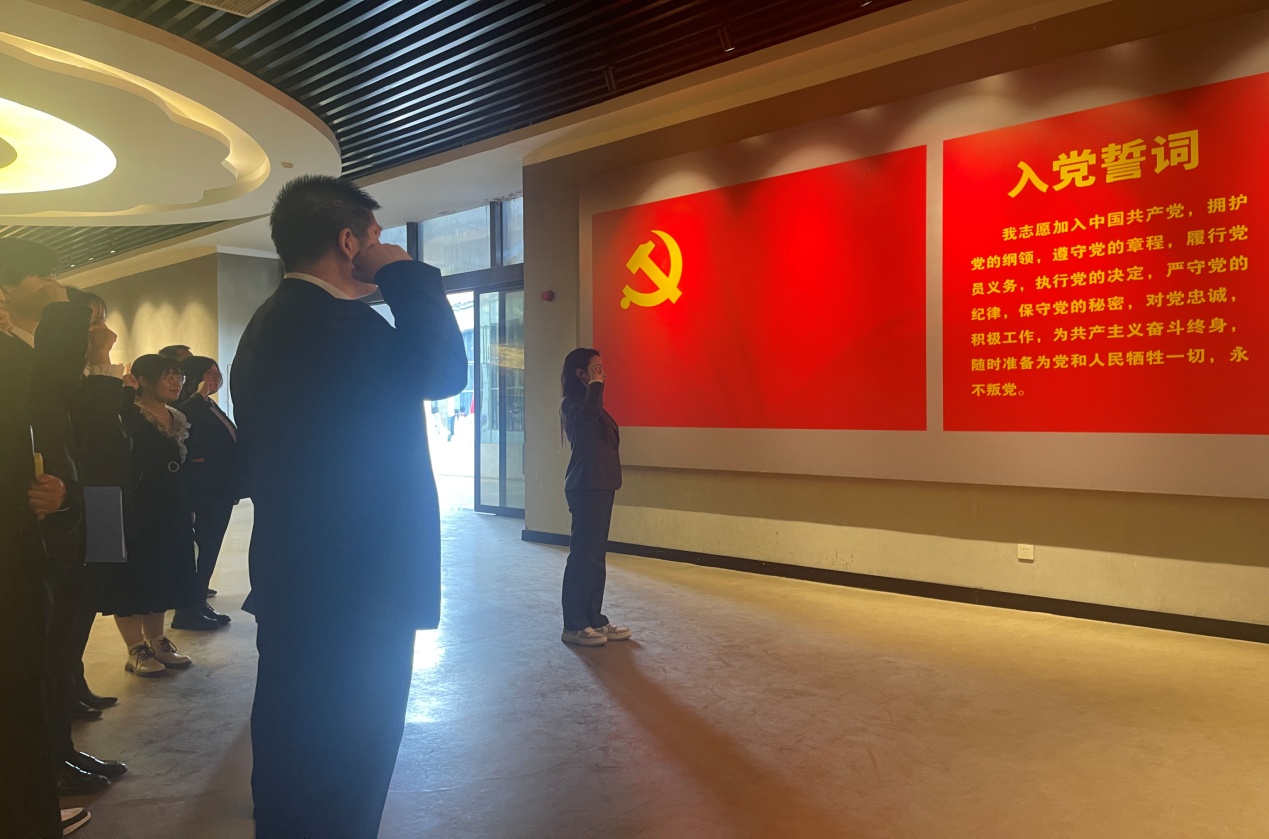 其次,全体党员面对鲜红的党旗,举起右手,用铿锵有力的声音重温入党誓词,以铮铮誓言表达向革命先烈学习的决心。